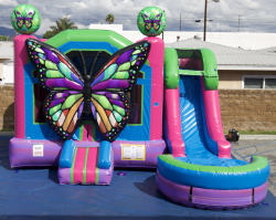 The vibrant colors of this Butterfly Combo features a large bouncer area, basketball hoop and slide with splash pad to provide hours of fun. The unit was designed with mesh sides all around to have full visibility for parents and spectators.